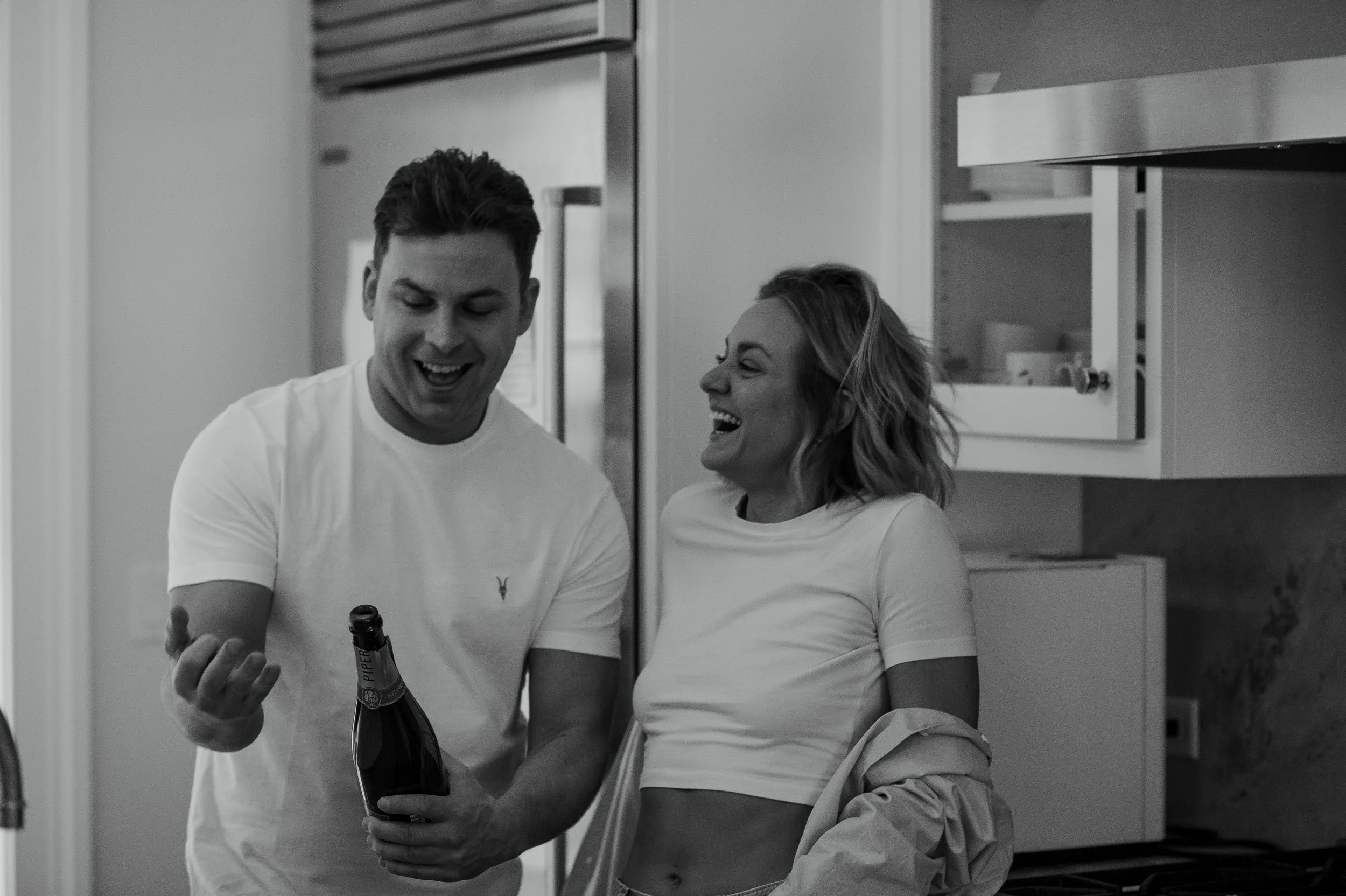 Instead of stiff posing, this session focused on movement and connection. From leaning into each other at the kitchen counter to wrapping up together with a glass of wine, every moment felt genuine and unforced. This style of in home couples photography in Boston is perfect for couples who want images that feel editorial yet natural and deeply personal.